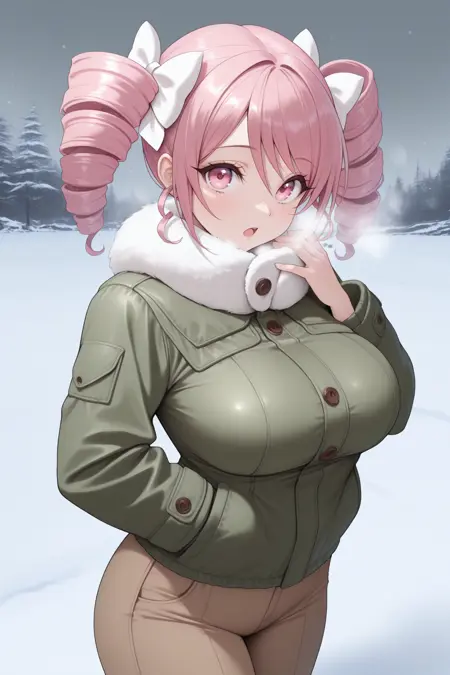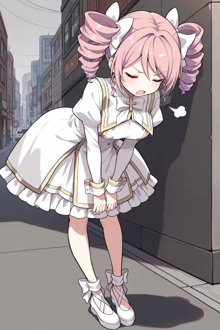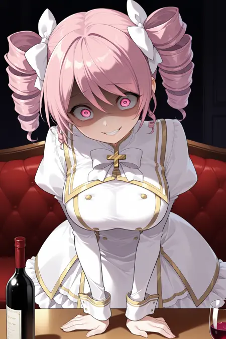 トリガー語は "dkpino" であり、"ピンクの髪、ツインドリル、短髪、ピンクの目、髪のリボン、白いリボン" が必須です。