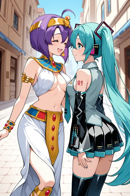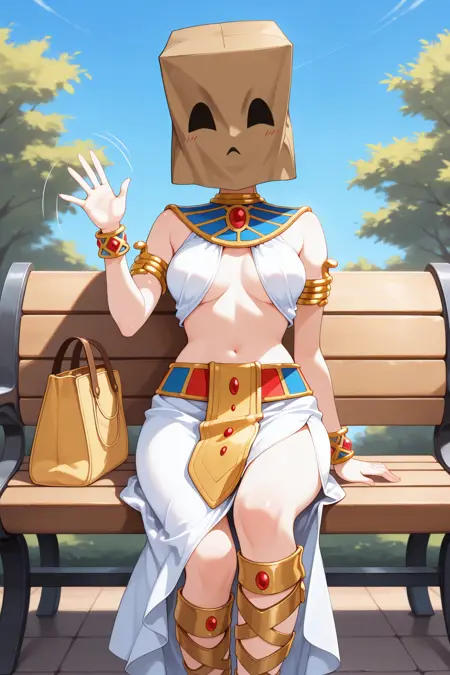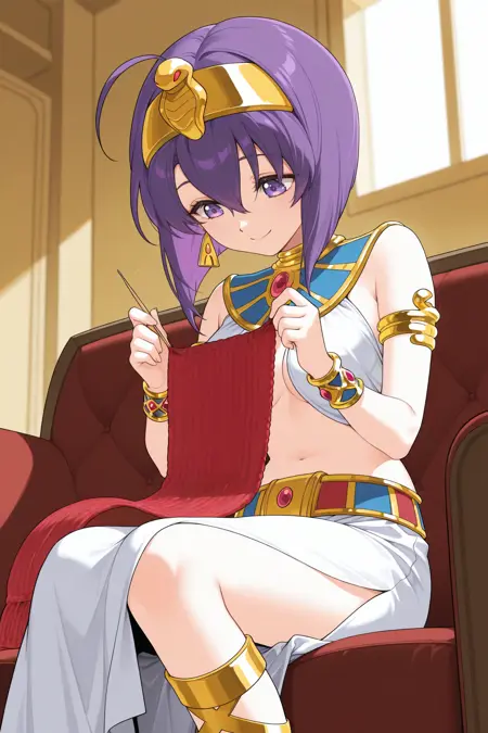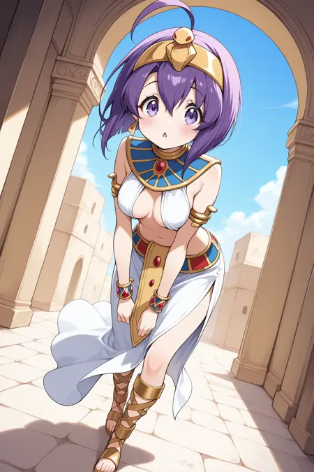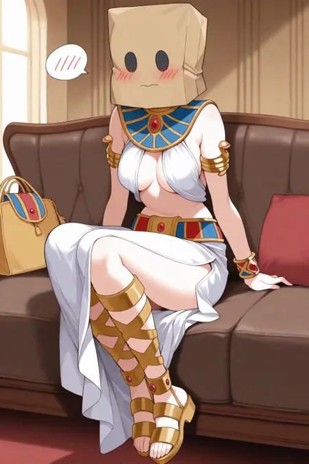그녀의 전형적인 외모를 위해 "금 귀걸이, 금 헤어밴드, 우세크 목걸이, 복부, 금 팔찌, 흰 치마, 다색 벨트, 측면 슬릿, 금 팔찌, 글라디에이터 샌들"을 추가하세요.