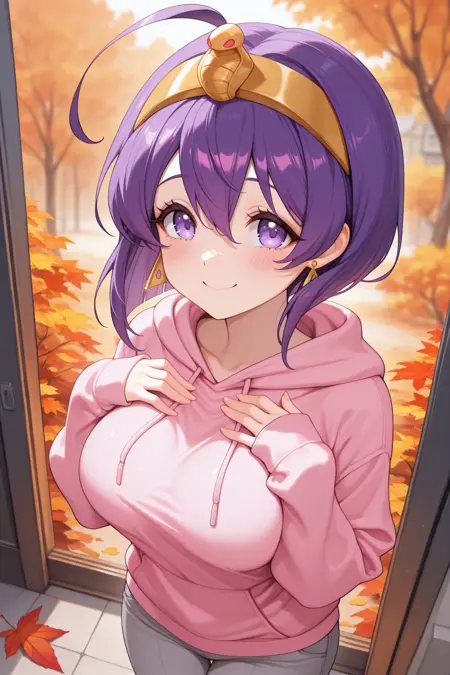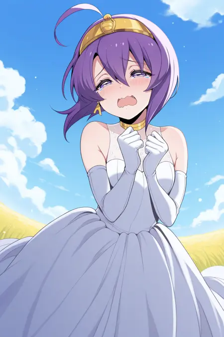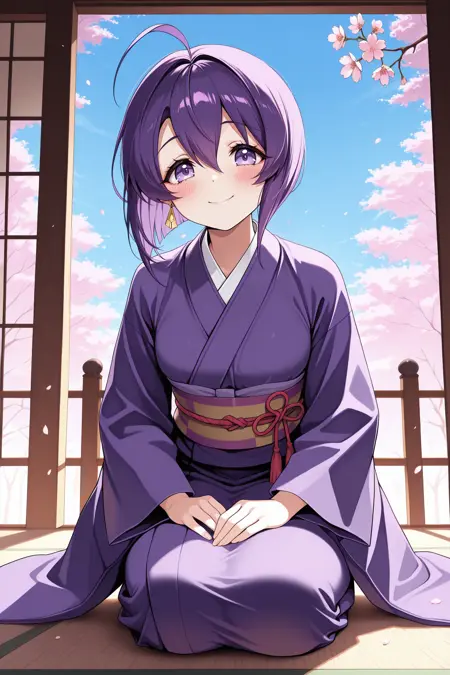 트리거 단어는 "dkmed"이며, "보라색 머리카락, 단발, 아호게, 눈 사이의 머리카락, 보라색 눈"이 필수입니다.