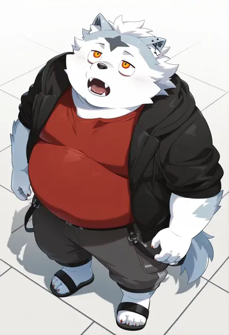 valkianiki, 1boy, solo, furry, male focus, red shirt, hooded jacket, upper body, looking at viewer, fang out, plump