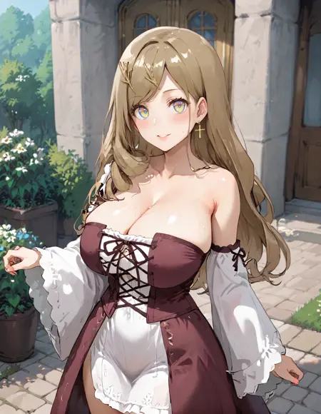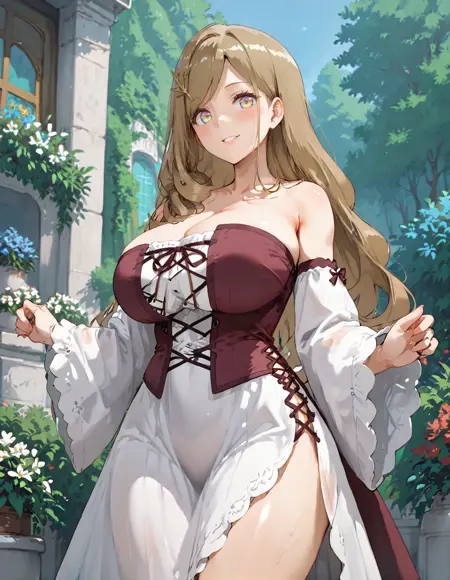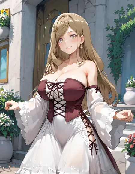 for her default outfit, add in: dress, cross-laced clothes, strapless, detached sleeves, wide sleeves,
