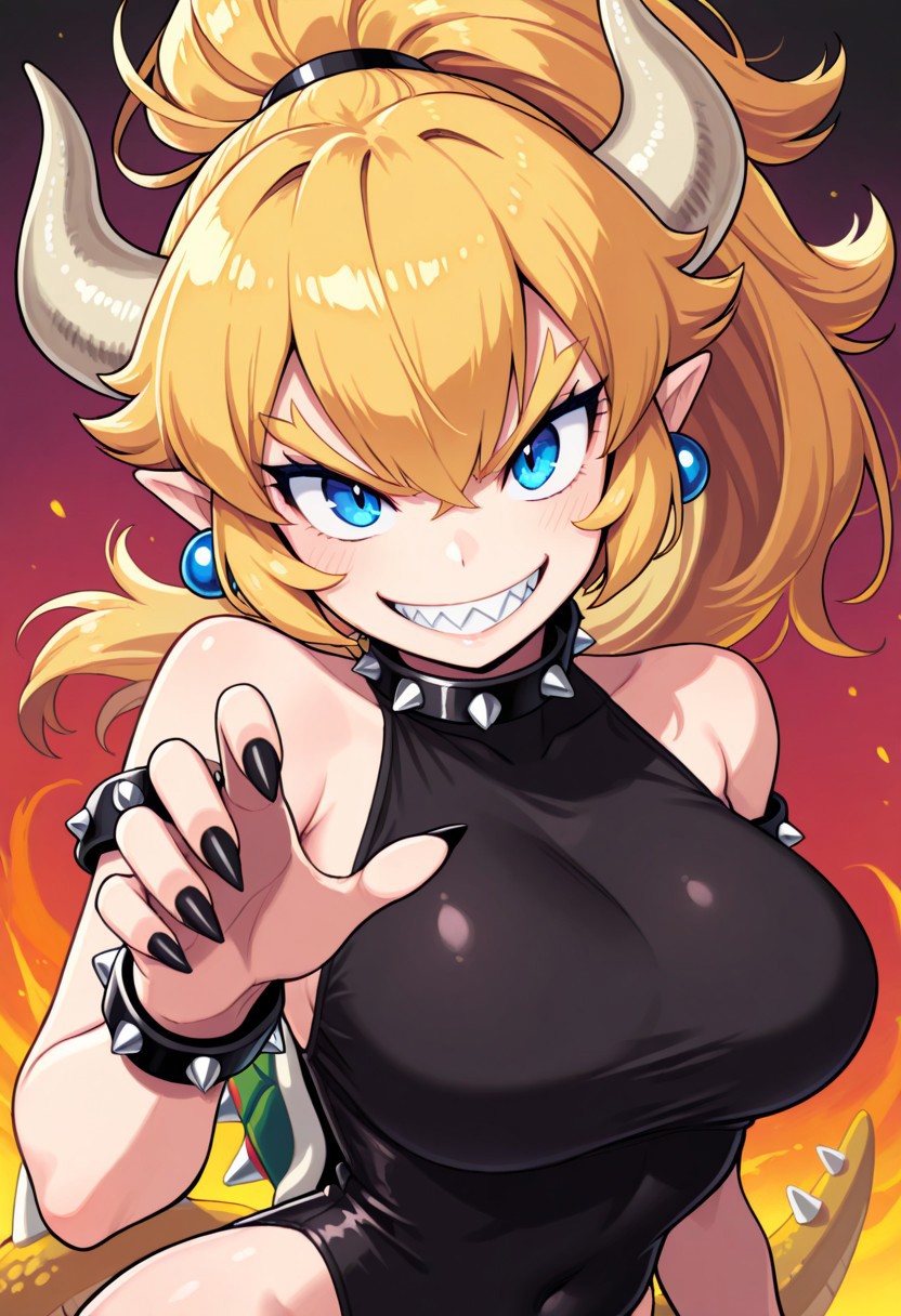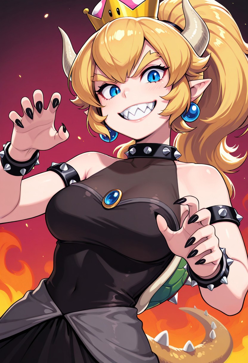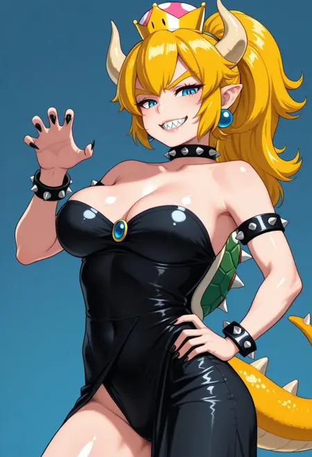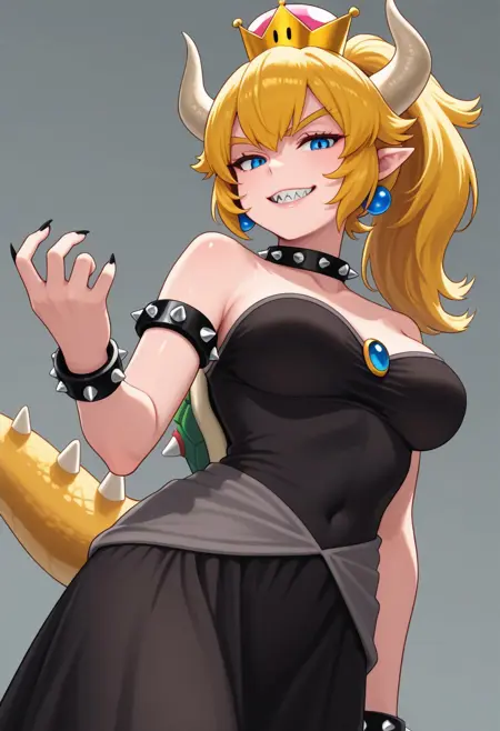 标签:bowsetteILL,超级王冠,珠宝,角,金发,蓝眼睛,带刺项圈,带刺手环,蓝色耳环,尖牙,尾巴,尖耳,马尾,臂环,黑色连衣裙,紧身衣,露肩,无袖,长发,带刺龟壳,带刺尾巴,黑色指甲,尖锐指甲,