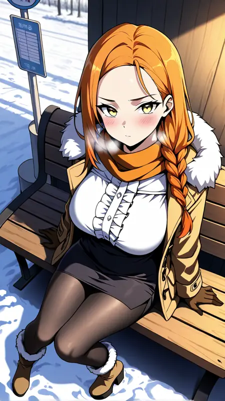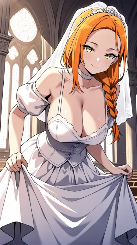 1girl, solo, il_may, yellow eyes, braid, hair over shoulder, single braid, forehead, orange hair, large breasts,