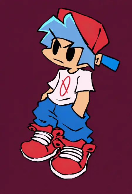 | トレーニングワード | MilkBoyfriendFNF, 1boy, tan skin, spiky cyan hair, backward light red cap, blue brim, magenta-white short-sleeved T-shirt with a red prohibition symbol, baggy blue pants, red sneakers with magenta-white shoelaces, magenta-white soles, short, black eyes, chibi, コピーしました! |