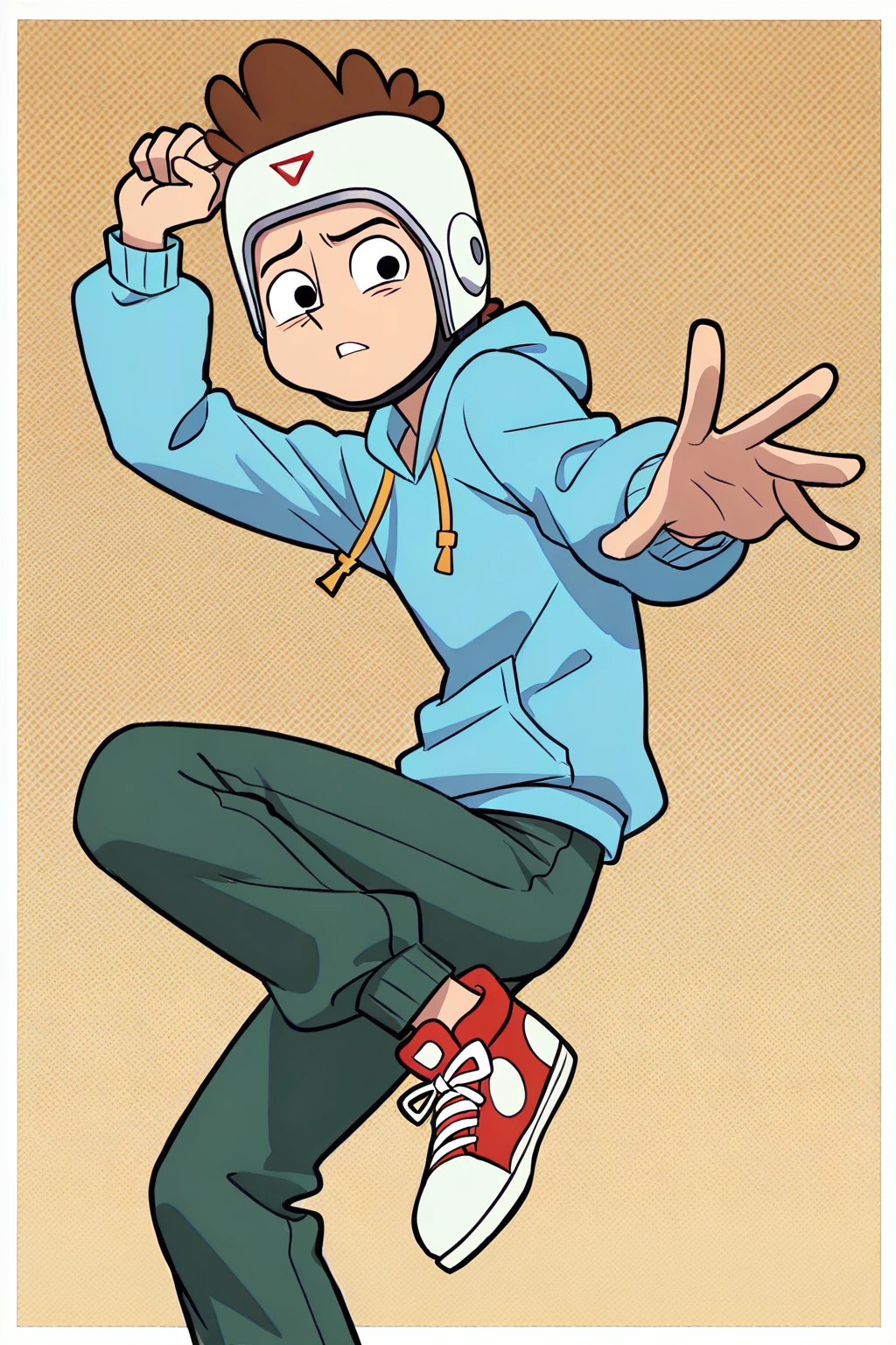 MickeyTDRR, 1boy, brown hair, cream colored helmet, light blue hoodie, dark green pants, red sneakers, black eyes, mickey (tdi),
