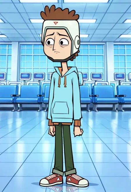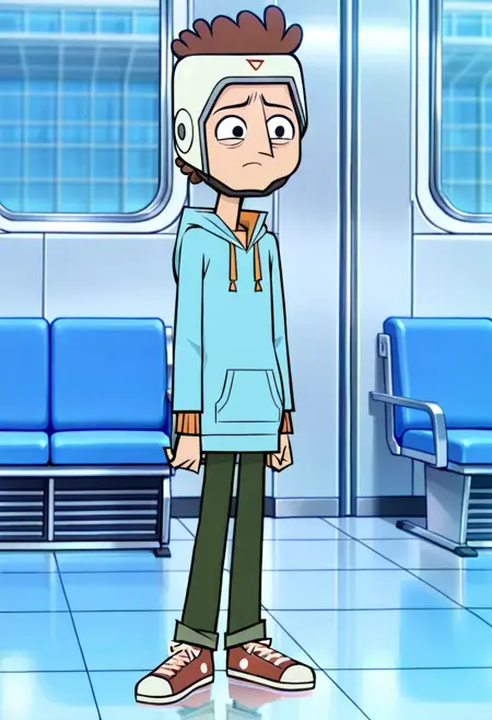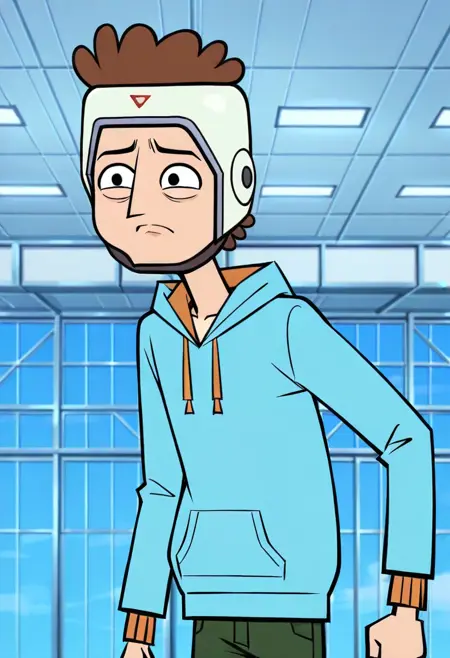 MickeyTDRR, 1boy, brown hair, cream colored helmet, light blue hoodie, dark green pants, red sneakers, black eyes