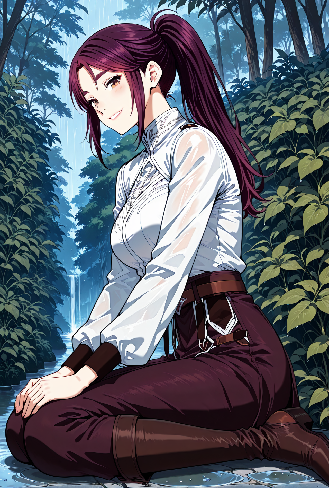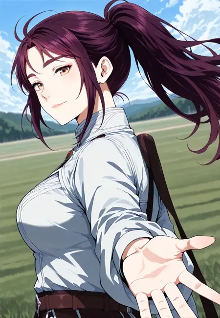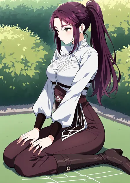 1 girl, solo, brown eyes, purple hair, long hair, ponytail, sidelocks, thick eyebrows