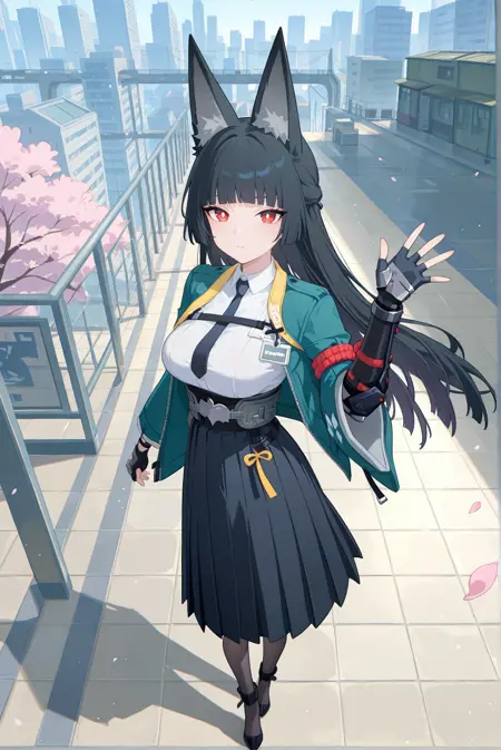 복장: h-miyabi, miya-suit, 1girl, 빨간 눈, 흰색 동공, 밝은 동공, 검은 머리, 긴 머리, 앞머리, 여우 귀, 녹색 재킷, 가슴 스트랩, 아이디 카드, 칼라 셔츠, 흰색 셔츠, 넥타이, 하이웨이스트 스커트, 검은 스커트, 긴 스커트, 벨트, 팬티후스, 갑옷 장갑, 손가락 없는 장갑, 검은 장갑, 하이힐