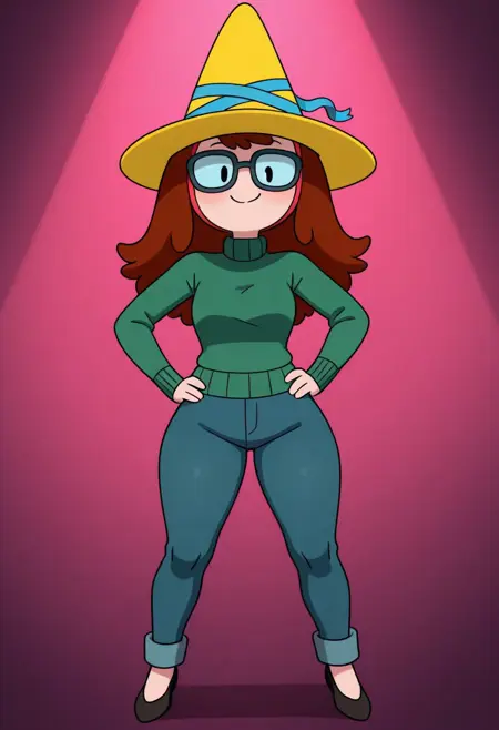 Tag: bettygrofILL, brown hair, glasses, long hair, green sweater, dot pupils, blue pants, turtleneck,