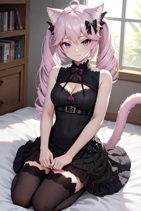 "Nyanners2022, twintails, cat ears, hair bow, black dress, sleeveless dress, cleavage cutout, black thighhighs"