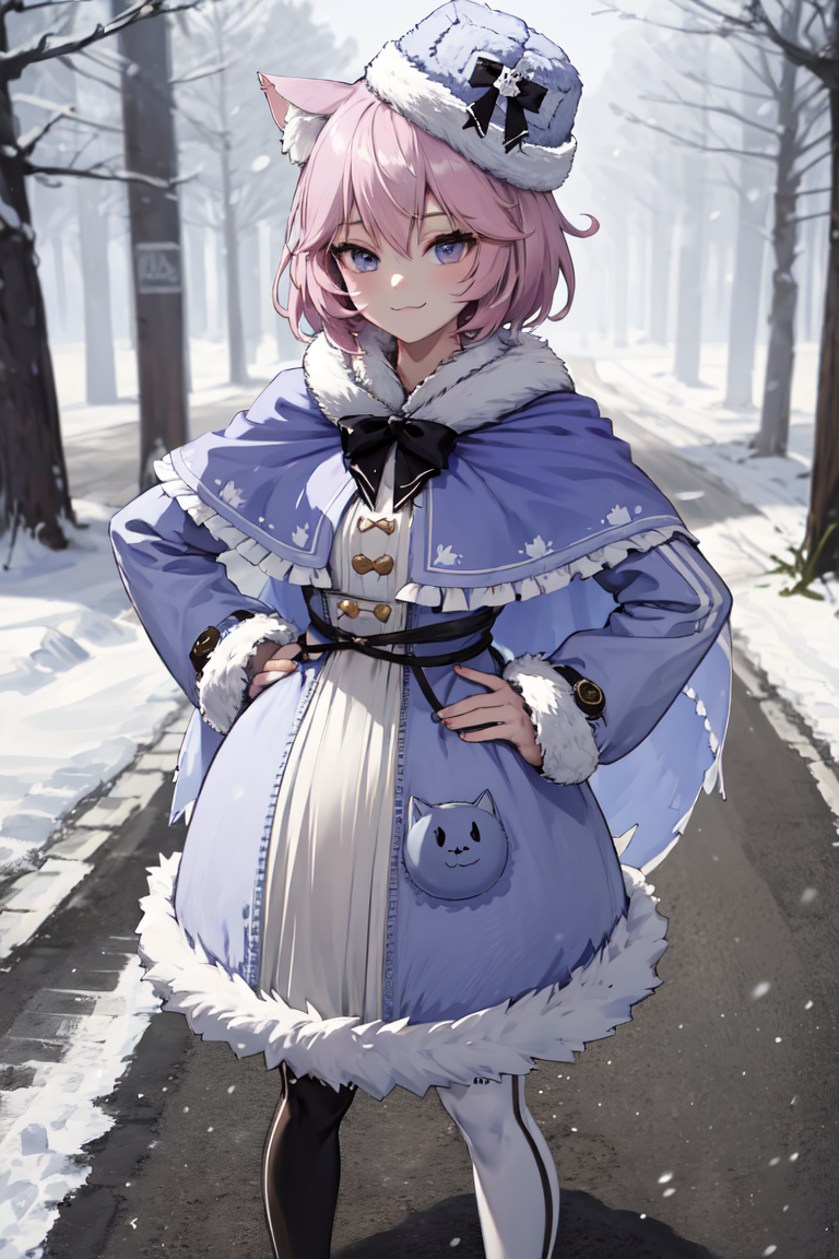"NyannersWinter, cat ears, fur hat, winter clothes, fur-trimmed dress, fur-trimmed capelet, cat ear legwear, asymmetrical legwear"