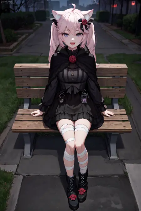 "NyannersHalloween, cat ears, twintails, hair flower, black dress, lantern, black capelet, bandaged leg, boots"