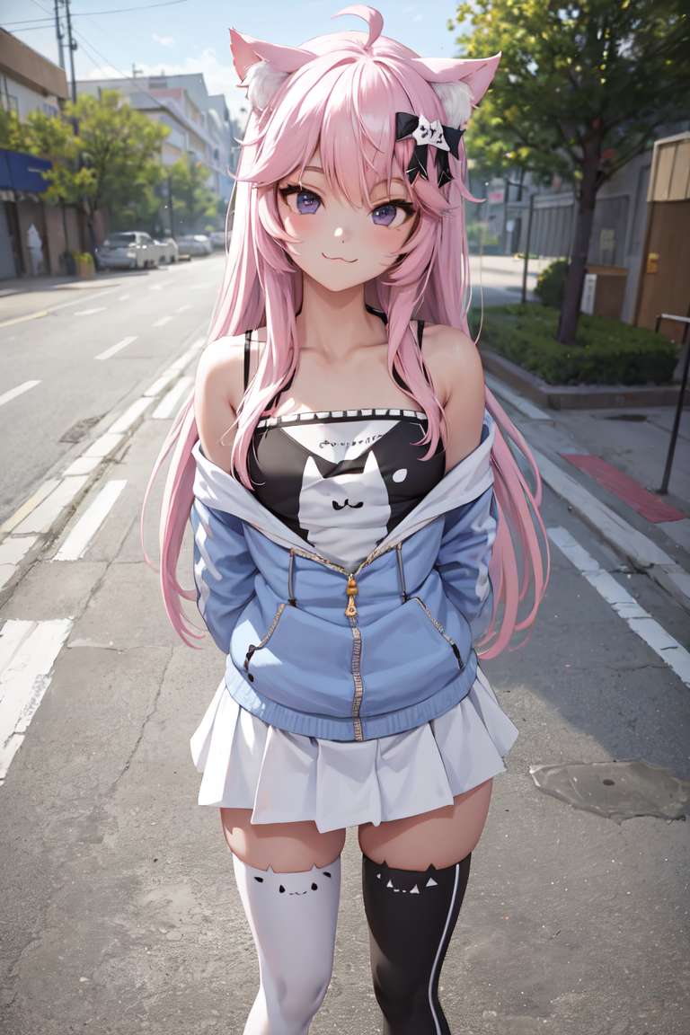 "NyannersBase, cat ears, hoodie, long sleeves, camisole, cat print, white skirt, cat ear legwear, asymmetrical legwear"