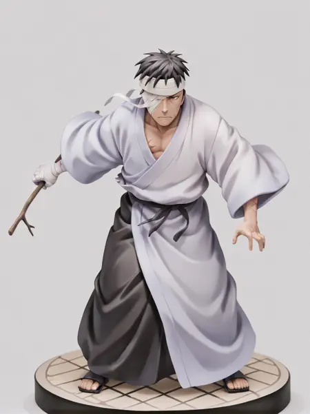Main Words: "black hair, old, single brown eye, scar on face, bandage over one eye, bandages, japanese clothes, one eye covered"