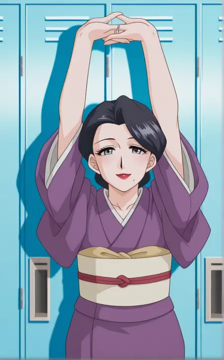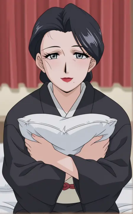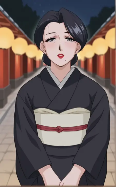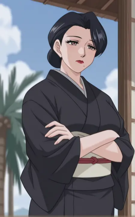 BlackKimono_SumieTakayanagi_ownwaifu, 1girl, black hair, black kimono, breasts, grey eyes, japanese clothes, lipstick, makeup, mature female, mole under mouth, red lips, short hair, single hair bun, eyelashes, sash, hair up, large breasts, lips, long sleeves, obi,