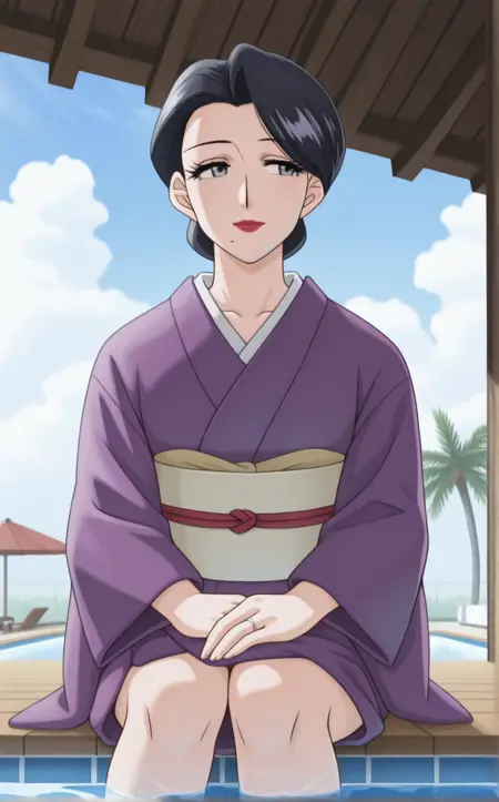 PurpleKimono_SumieTakayanagi_ownwaifu, 1girl, black hair, breasts, grey eyes, japanese clothes, lipstick, makeup, mature female, mole under mouth, purple kimono, red lips, single hair bun, obi, sash, short hair, long sleeves, collarbone, hair bun, eyelashes, lips, swept bangs, wedding ring, wide sleeves, white skin,