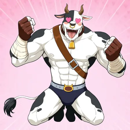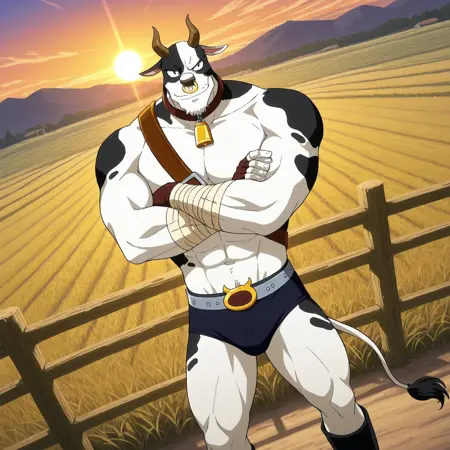 使用タグ: 男性、ウシ科、牛、筋肉質、筋肉質な男性、腹筋、男、ふりー、ふりーな男性、茶色い角、黒い目、黒い鼻、小さな瞳、顎ひげ、白い肌、牛模様の肌、尾、ベルト、黒い下着、黒いブーツ、手首の包帯、茶色の指なし手袋、牛の鈴、ゴールデンの鼻輪