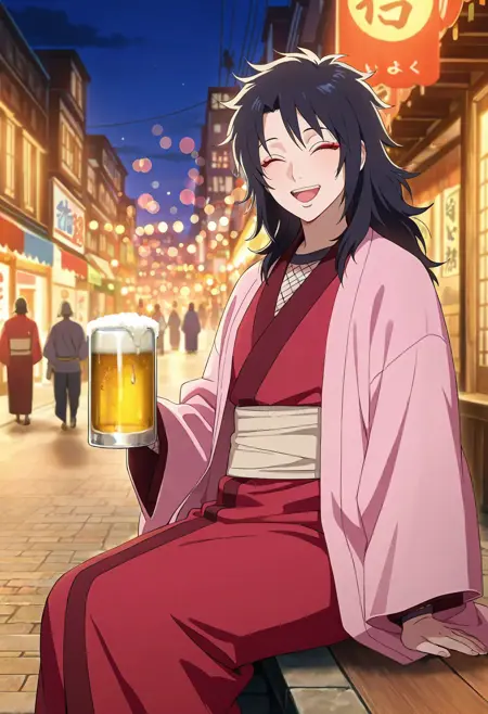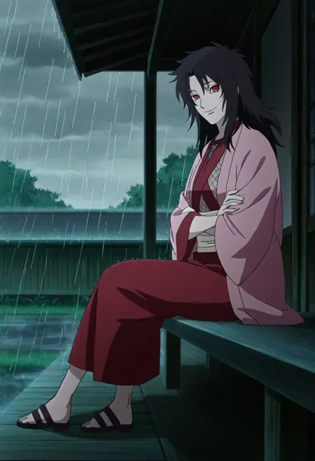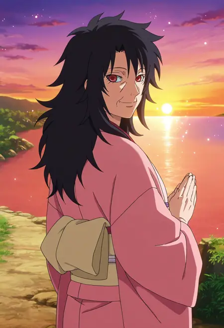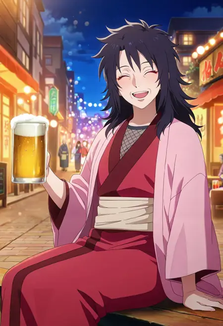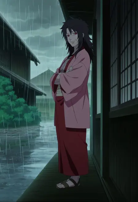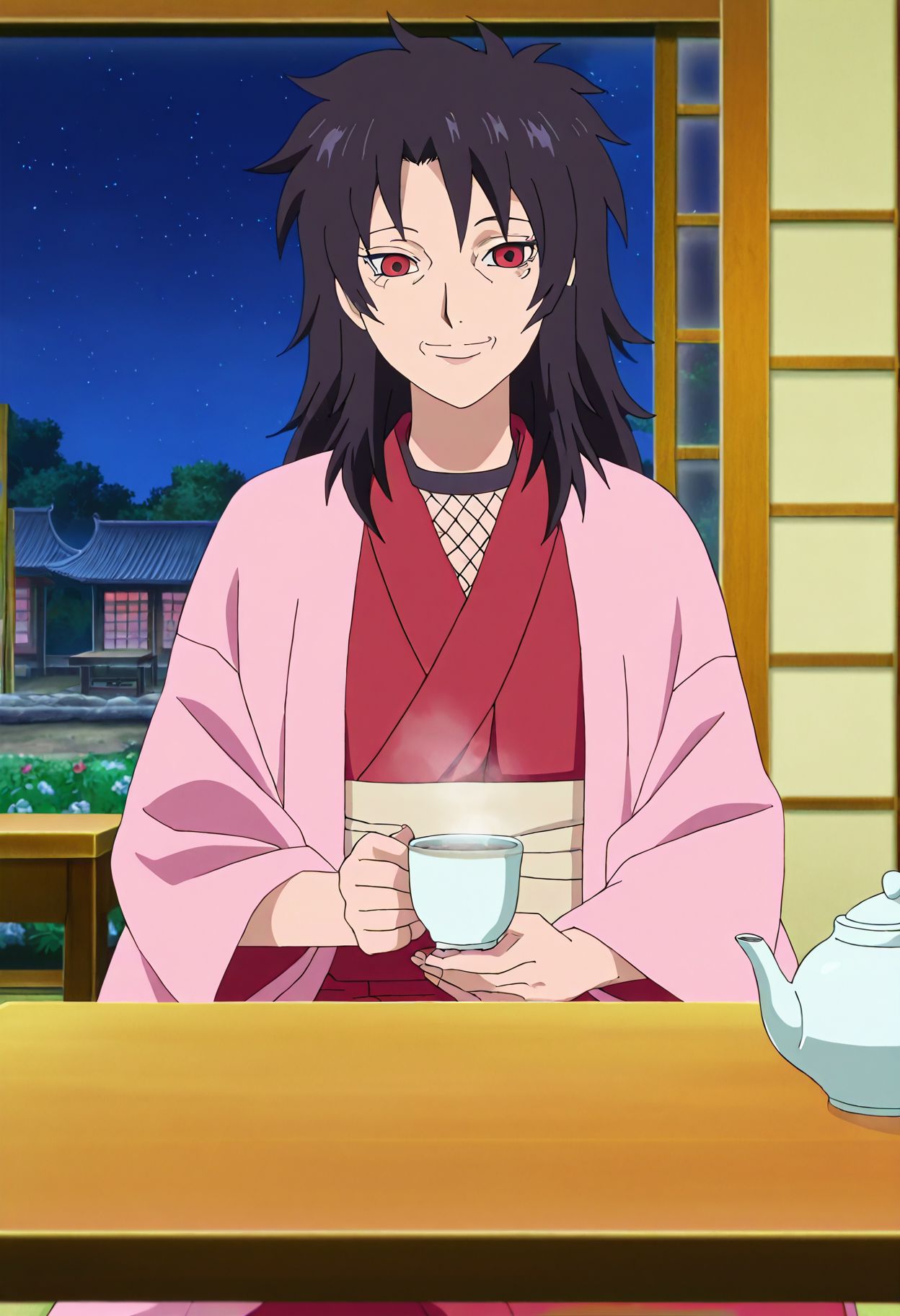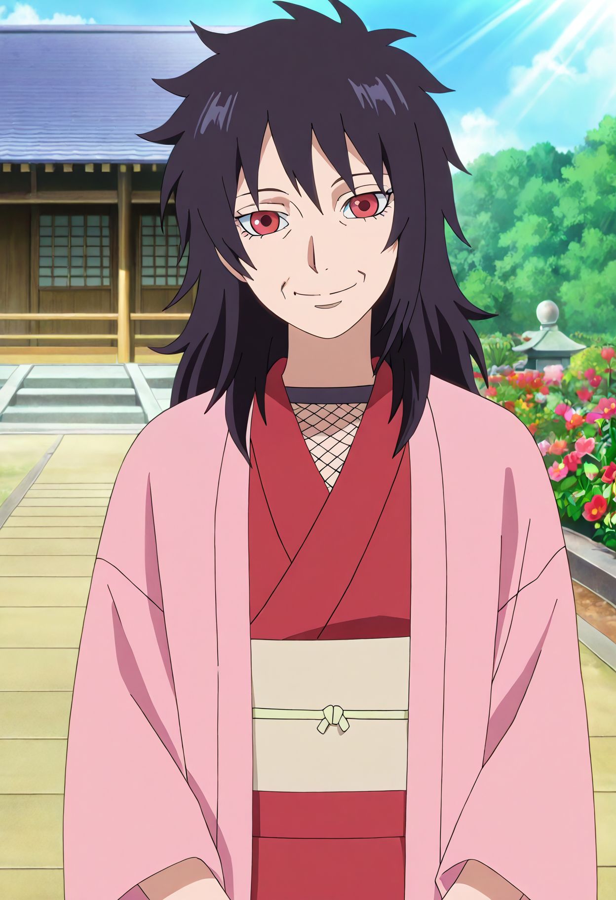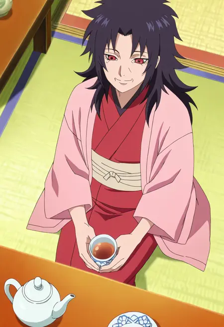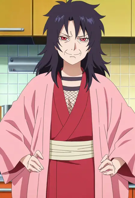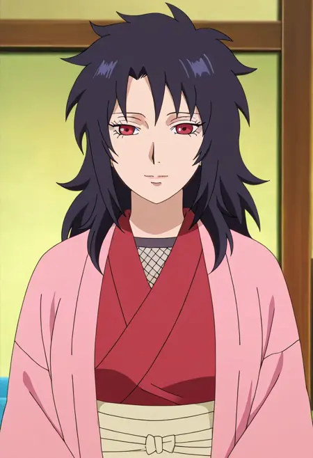 Prompt: yuuhi_kurenai, 1girl, black hair, long hair, red eyes, japanese clothes, red kimono, pink haori, beige obi, fishnet top, source_anime, anime screencap