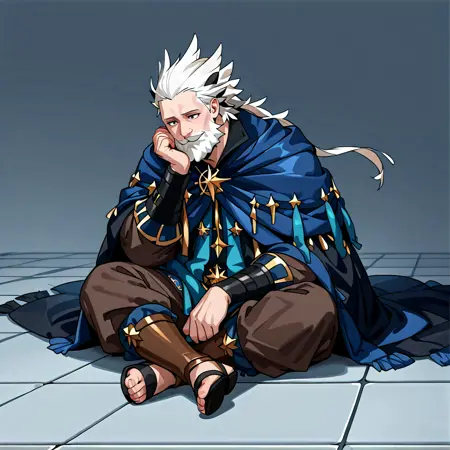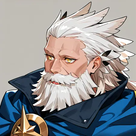 外貌:(满脸胡须,白色胡须,胡须覆盖嘴巴:1.2),白发,双色发,向后梳的发型,黄眼睛,长马尾