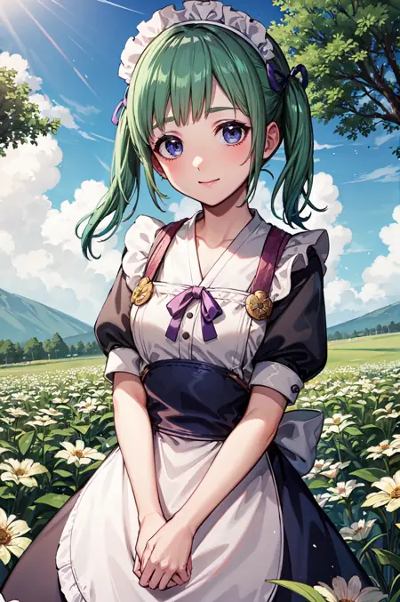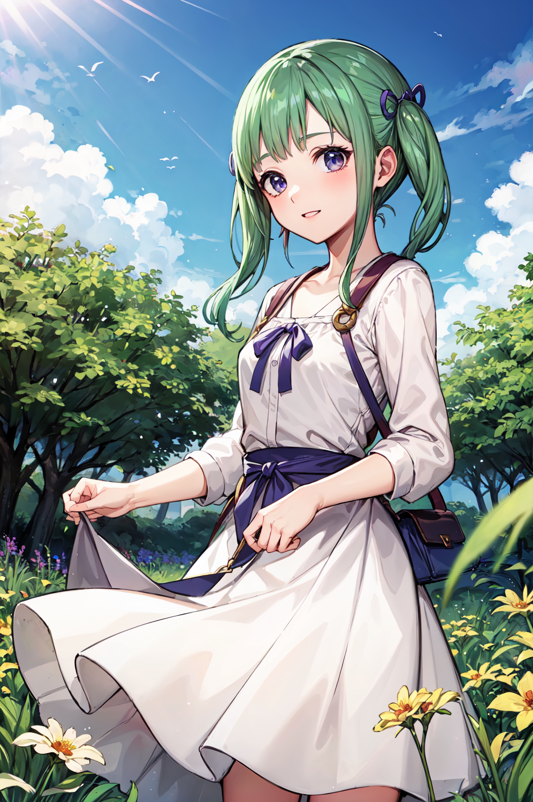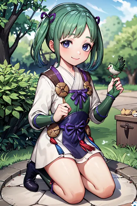 【默认服装提示】: midori, 日式服装, 婚礼手套, 黑色鞋履, 白色裙子, 长袖, 紫色丝带, 白色和服, 蓝色鞋履, 发带, 过膝靴, 手套