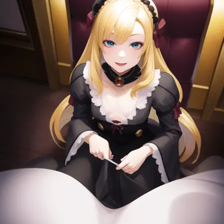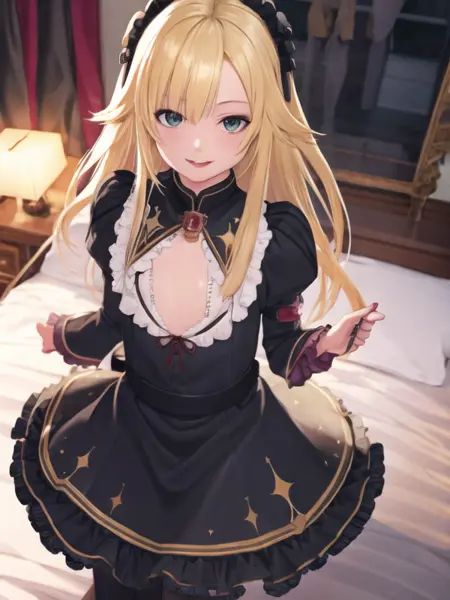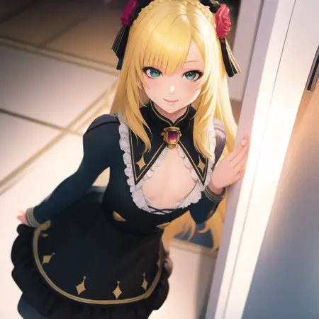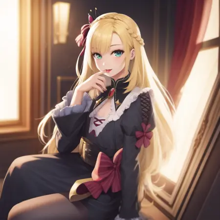 uzuki_kou,blonde hair,braid,flat chest,black clown,black dress,pantyhose,long skirt,long sleeves,hairband,