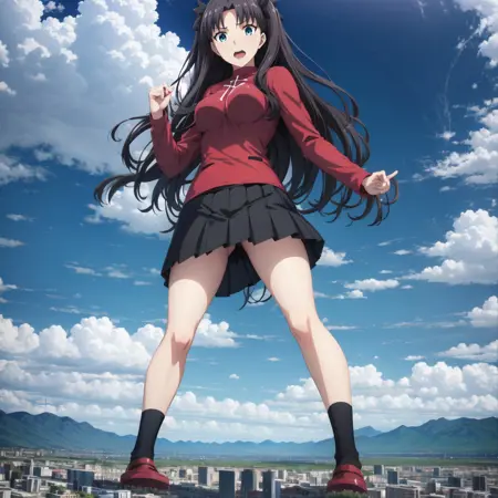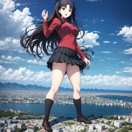 an anime artwork of a young lady standing on a tall city building, 1girl, solo, giantess, black skirt, sky, giant, cloud, day, full body, blue sky, city,