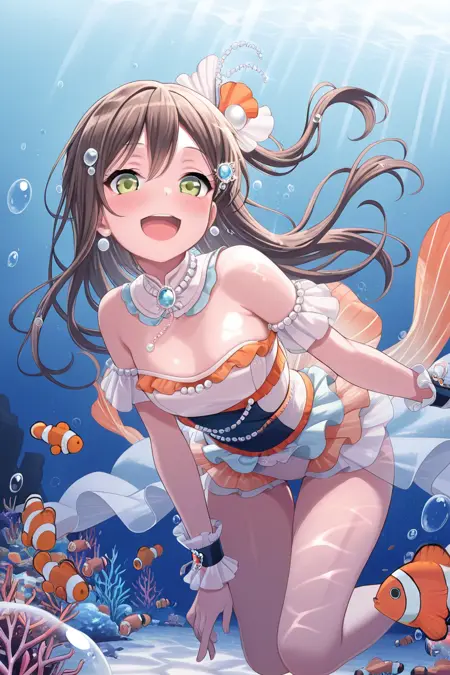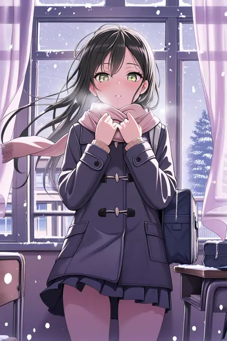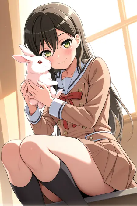 tae, 1girl, hanasakigawa school uniform, solo, long hair, school uniform, green eyes, looking at viewer, black hair, smile, brown dress, dress, blush, bangs, buttons, double-breasted, ribbon, long sleeves, neck ribbon, red ribbon, sailor dress, red bow