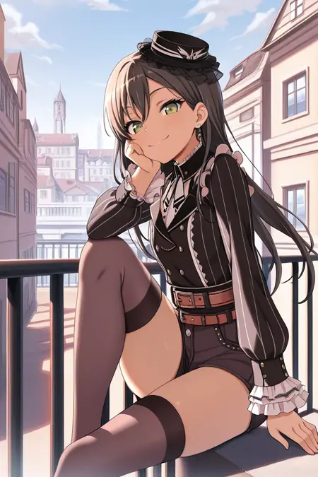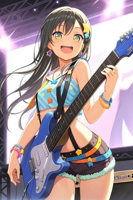 tae, 1girl, solo, long hair, green eyes, necktie, smile, thighhighs, jewelry, earrings, shorts, looking at viewer, suspenders, black shorts, star (symbol), black hair, blue necktie, star print, blush, star earrings, shirt, black thighhighs, bare shoulders, onstagesk
