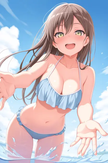 tae, 1girl, solo, long hair, green eyes, black hair, looking at viewer, smile, blush, blue shirt, shirt, pants, short sleeves, collarbone, white pants, bangs, black hair, hair between eyes, casual