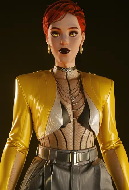 LoRA of Aurore Cassel, a memorable side character from Cyberpunk 2077 . It captures Aurore’s short red hairstyle, golden eyes and futuristic fashion. Ideal for cyberpunk-themed renders, portraits, and stylish compositions.