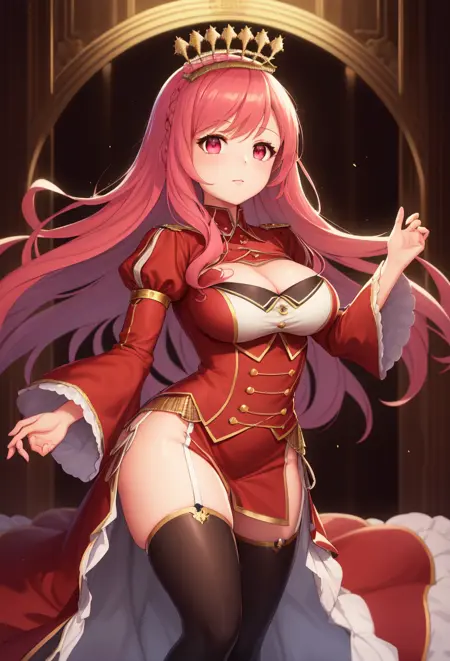 Everlasting message clothes: everlasting_message, crown, red dress, cleavage cutout, black thighhighs, pelvic curtain