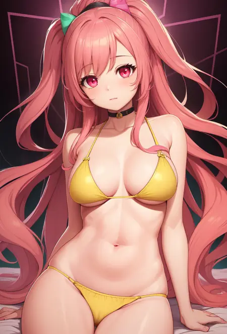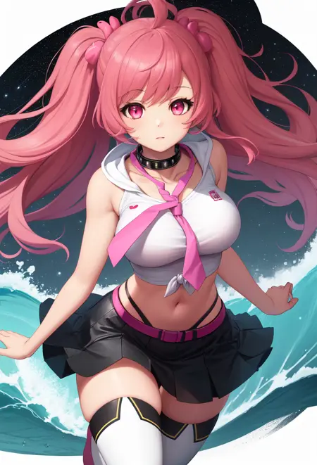 VividWave clothes: (vividwave, pink necktie, black skirt:1.2), star collar, hair ornament, white thighhighs, sleeveless, midriff