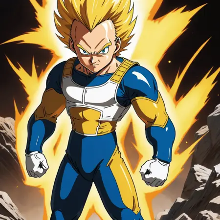 Album Cover Art Son Goku from Dragonball Z going super-sayajin 1, keyframe anime screencap, SSJ1 (in the style of Akira Toriyama), Album Cover Art, often for music albums, band branding, or iconic cover designs.