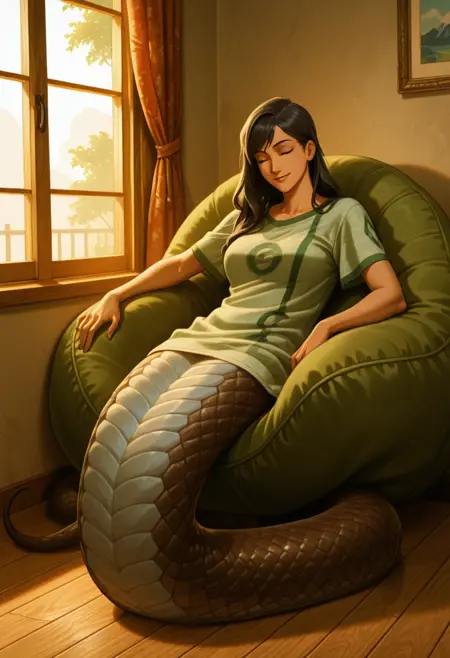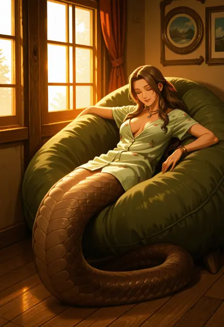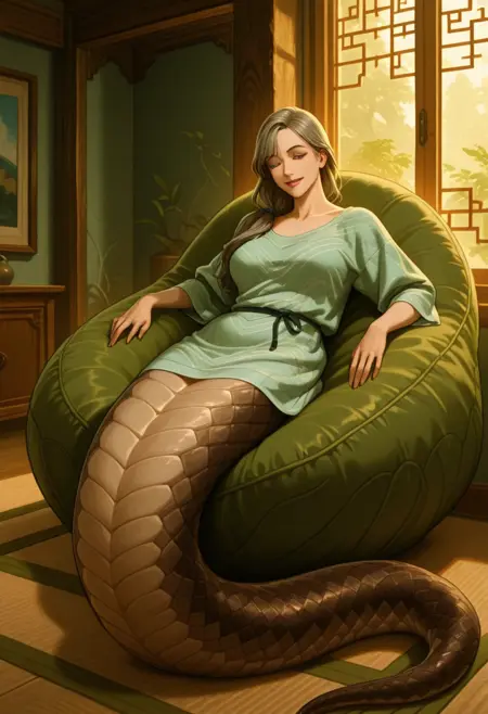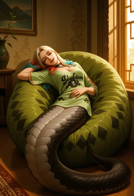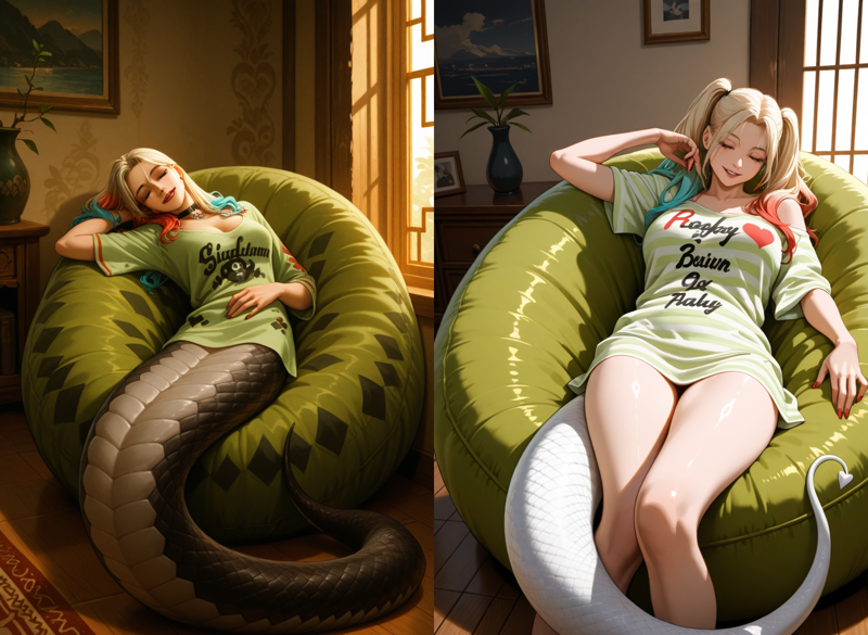 "SnakePerson, (masterpiece, best quality:1.2), amazing quality, very aesthetic, 32k, absurdres, newest, scenery, 1girl, solo, detailed face, smiling sweetly, beautiful gorgeous 18yo Harley Quinn, elegant snake tail, wearing a long green intricate chinese pajama shirt, circled on a giant beanbag chair, sleeping, background in a cozy living room"