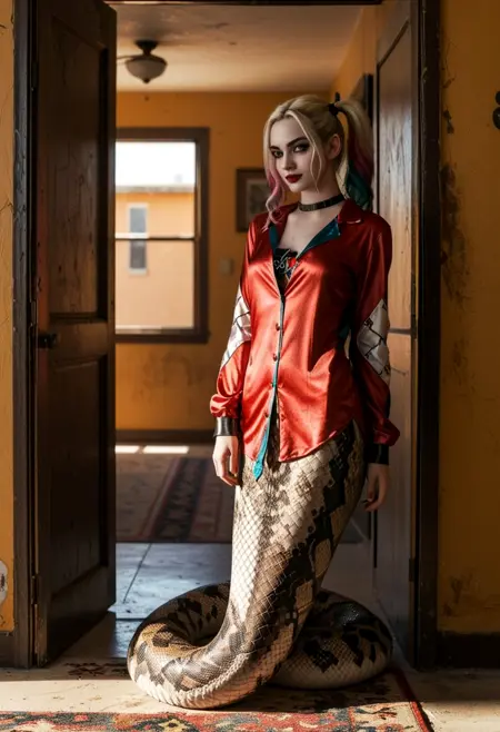 "SnakePerson, (masterpiece, best quality:1.2), amazing quality, very aesthetic, 32k, absurdres, newest, scenery, 1girl, solo, detailed face, smiling sweetly, beautiful gorgeous 18yo Harley Quinn, elegant snake tail, wearing a long green intricate chinese pajama shirt, circled on a giant beanbag chair, sleeping, background in a cozy living room"