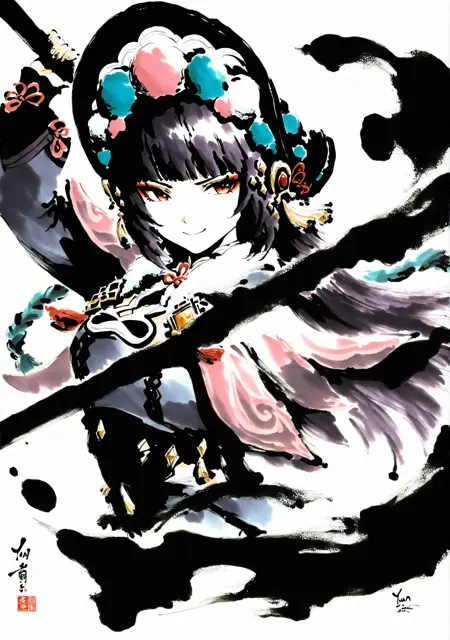 noob 1.1을 기반으로 한 수묵 스타일로, 한 장의 수묵화를 통해 1,500장의 이미지를 학습시켰습니다. 학습 데이터 중 일부 이미지의 배경에 있던 용, 개, 야수 등의 요소가 제대로 인식되지 않아, 생성된 이미지에 자주 개가 등장합니다(ComfyUI에서 특히 심각함). 향후 이 문제가 수정될지 불확실합니다. 원래 IPA는 다양한 화가 스타일의 혼합 효과에 더 잘 맞았습니다. LoRA나 트리거 단어의 가중치를 적절히 낮추면 수묵 성분을 줄일 수 있습니다. 데이터셋 해상도의 제한으로 인해, 생성 시 해상도가 너무 높으면 붓터치에 영향을 줄 수 있습니다.