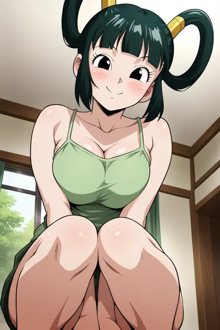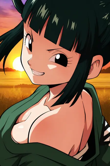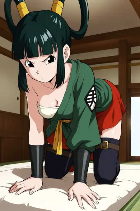 緑の着物、巻き布、片方の肩を露出、赤いスカート、ハイソックス