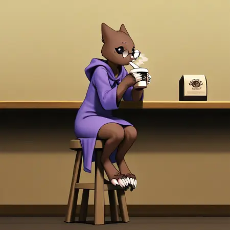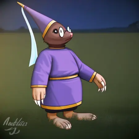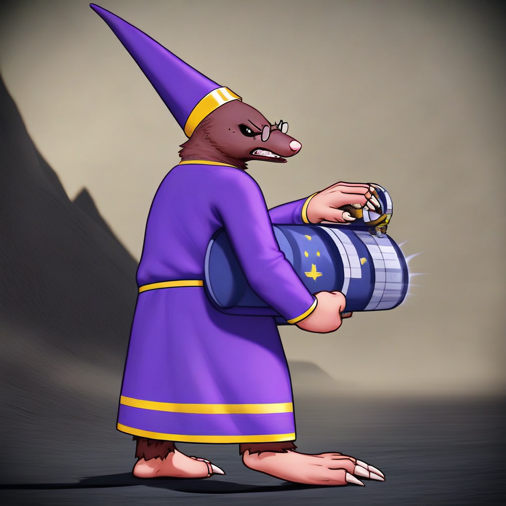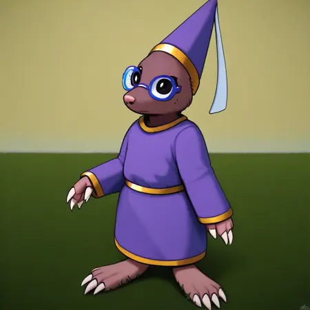 Siobhan_SS, feral, mole, brown fur, female, claws, paws, glasses, purple robe, solo, barefoot, black eyes,