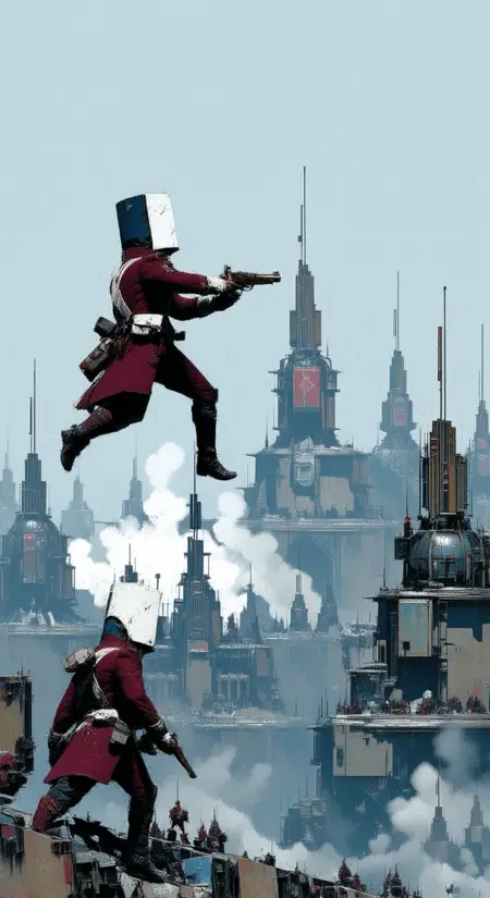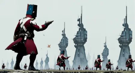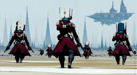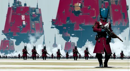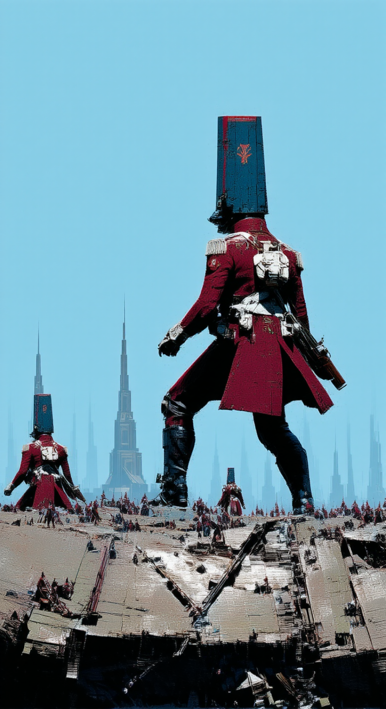 “GKG士兵”图像模型似乎是一个专门用于在反乌托邦背景下生成具有独特军事人物形象的生成模型。一致的触发短语“illustration of gkg soldier”激活了一种特定视觉风格:身着红色制服、佩戴独特头饰的士兵,背景为城市废墟。