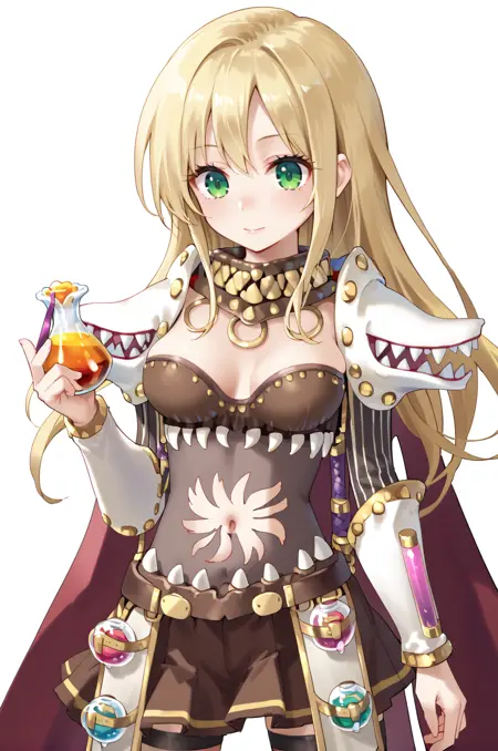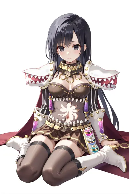 prompt: geneRO, vial, cape, brown skirt, navel, belt, clothing cutout, choker, o-rings, detached sleeves, living clothes, black thighhighs, high heels, white cross-laced knee boots