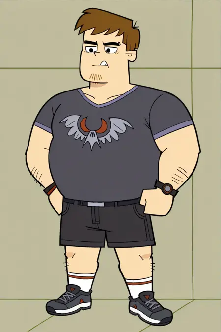 ChetTDRR, 1boy, short brown hair, stubbly chin, black eyes, thick black eyebrows, brown stubble, fat, chubby, chet (tdi),