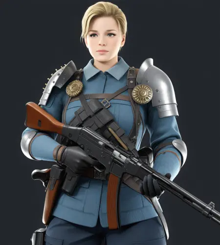 muller,短发,金发,蓝眼睛,写实风格,手套,手持,武器,黑色手套,腰带,盔甲,制服,黑色背景,肩甲,(高质量眼睛)