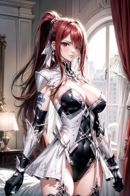 プロンプト:armor,greaves,high_heels,pauldrons,shoulder_armor,hair_ornament,gauntlets,cleavage,gloves,thighhighs,leotard,armor,gloves