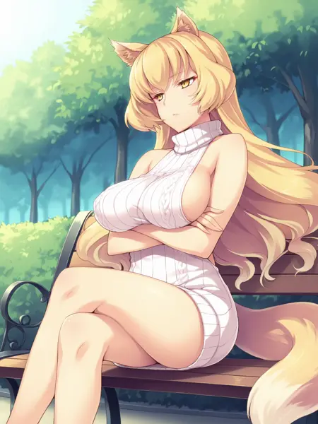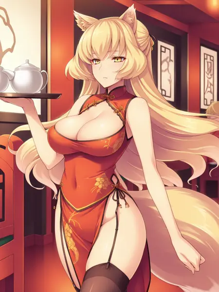 Apperance: kurokohaku, blonde hair, long hair, yellow eyes, fox ears, fox tail, large breasts