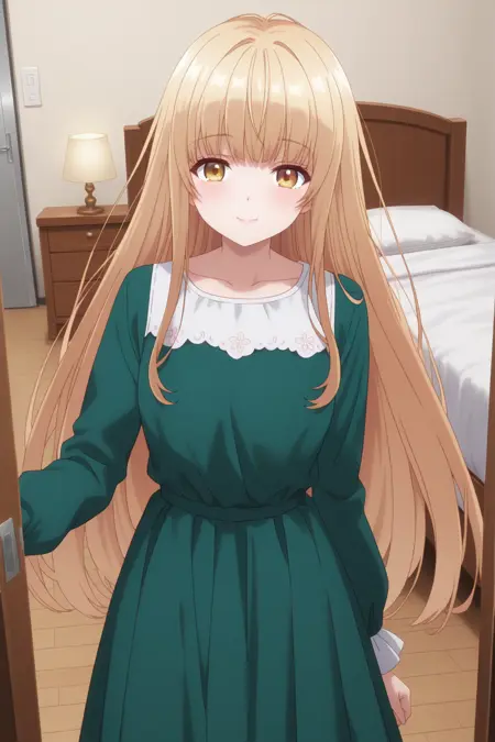 aamahiru, 黄色い目, 金髪, 前髪, mahiruc1, 白い collar, 緑のドレス, ロングドレス, 長袖,