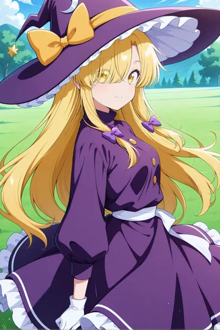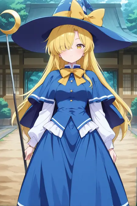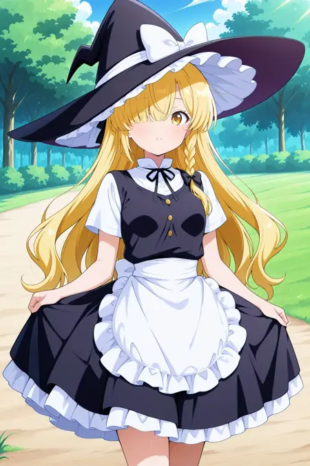 Marisa98, 1girl, solo, yellow eyes, blonde hair, long hair, hair over one eye, sidelocks, small breasts, witch hat, black hat, frilled hat, hat bow, white bow, hair ribbon, black ribbon, black shirt, white sleeves, short sleeves, waist apron, black skirt,