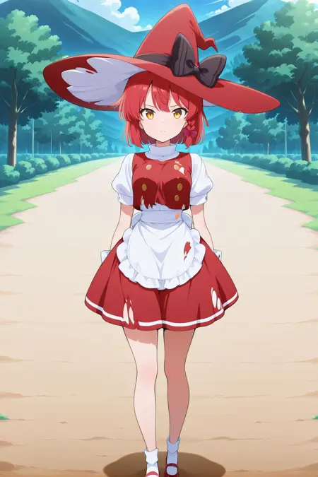 Marisa98, 1girl, solo, red eyes, red hair, short hair, small breasts, <lora:Marisa-Kirisame_IllustriousV2:1> witch hat, red hat, hair ribbon, red ribbon, black bow, hat bow, white shirt, short sleeves, puffy sleeves, red vest, torn vest, buttons, white wrist cuffs, waist apron, red skirt, socks, red mary janes, red boots,