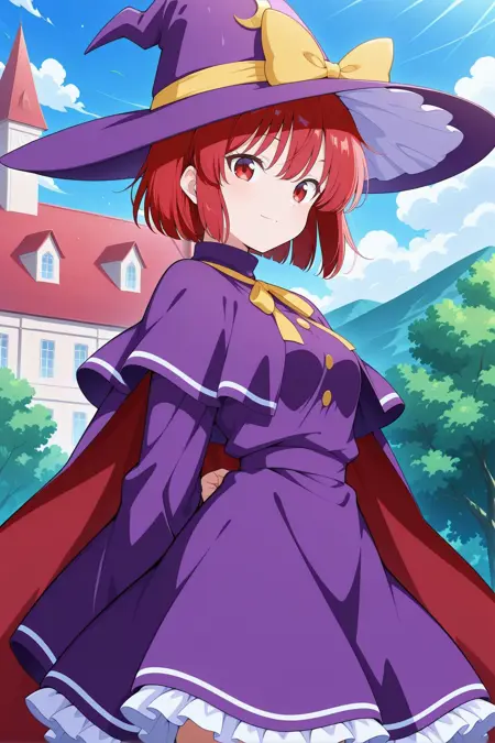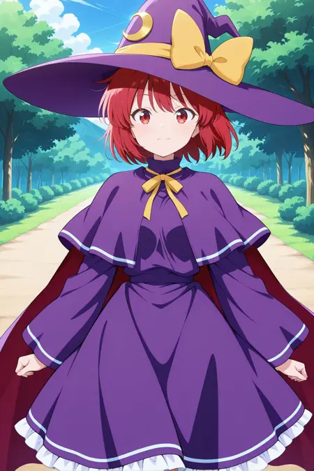 女巫帽, 紫色帽子, 帽子蝴蝶结, 黄色蝴蝶结, 帽子装饰, 新月形帽饰, 紫色斗篷, 紫色高领衫, 紫色连衣裙, 小斗篷, 花边裙摆, 长袖, 宽袖, 黄色颈带,