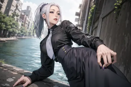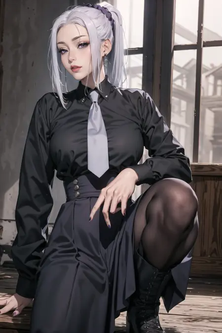 mei mei (jujutsu kaisen), 1girl, solo, grey necktie, (long skirt:1.2), dark purple skirt, high-waist skirt, black shirt, ponytail, white hair, nail polish, boots, long sleeves, hair scrunchie