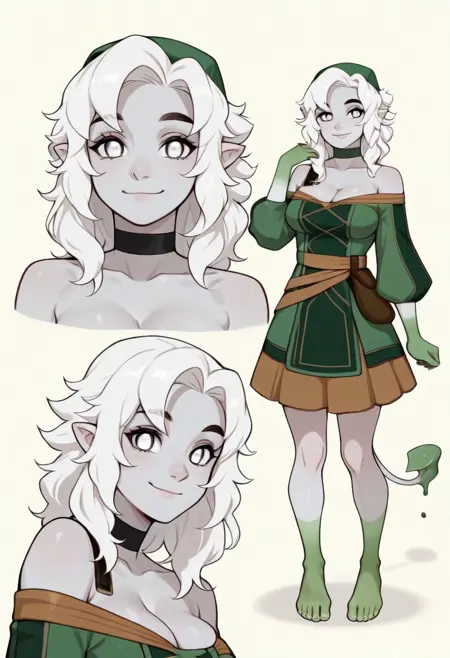 黏液、古基马斯图拉、提夫林、德鲁伊、黏液、怪物女孩、Q版、女性、1个女孩、浅灰色皮肤、有色皮肤、白发、长发、绿眼、白眼、尖耳、微笑、闭嘴、看向观众、胸部、裸露肩膀、落肩、黑色项圈、项圈、长袖、裙子、背包、绿色的手、绿色的脚、绿色的尾巴、菱形尾部、赤脚、举手、尾巴、全身、站立